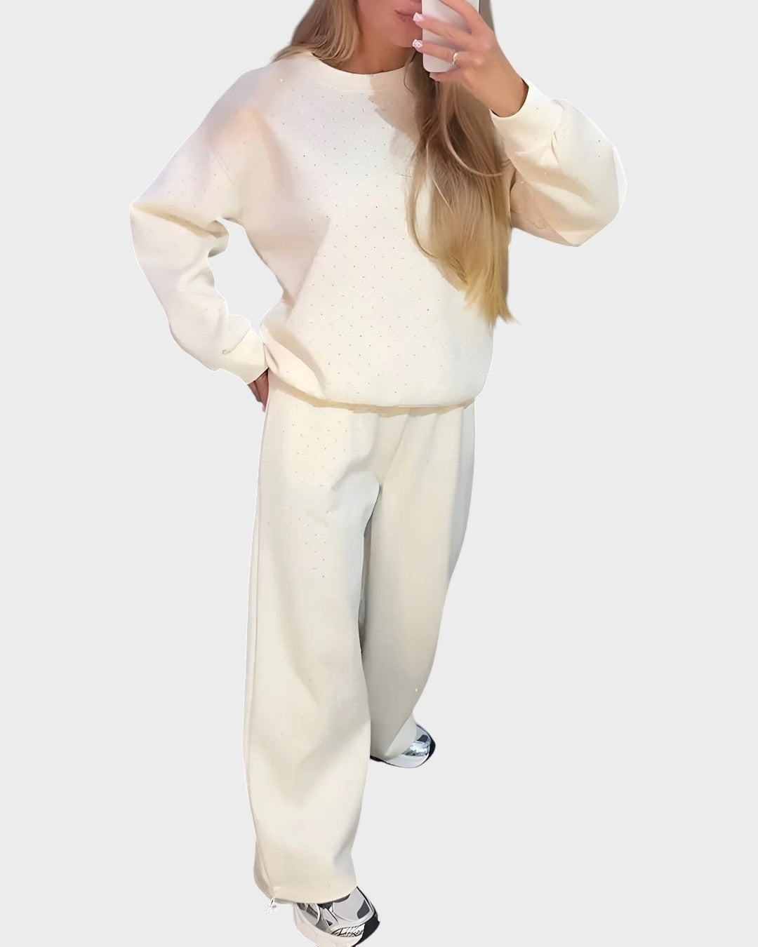 Táto súprava je vytvorená pre tých, ktorí radi spájajú pohodlie a eleganciu v jednom vzhľade. Mäkká tkanina a uvoľnený strih umožňujú voľnosť pohybu, zatiaľ čo jemný lesk dodáva nádych sofistikovanosti. Ideálna na bežné chvíle alebo ležérne výlety so štýlom.